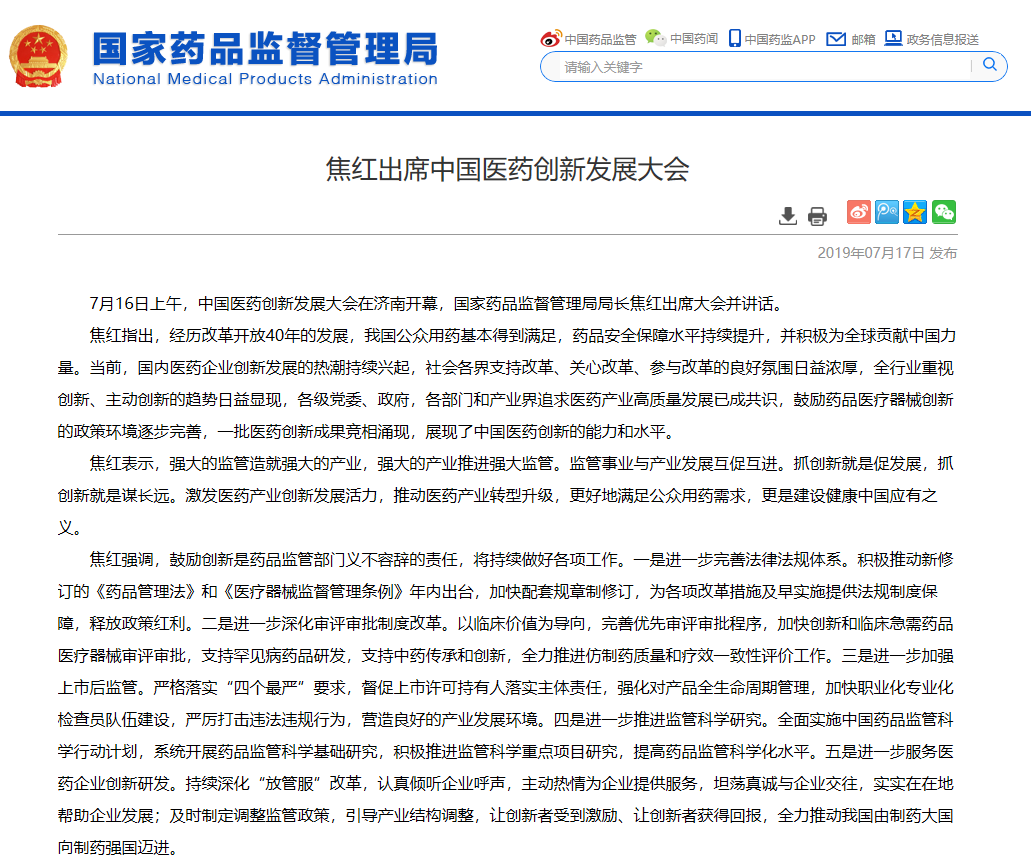 国家药监局局长焦红在中国医药创新发展大会上表示:“积极推动新修订的《药品管理法》和《医疗器械监督管理条例》年内出台,加快配套规章制修订,为各项改革措施及早实施提供法规制度保障,释放政策红利”。