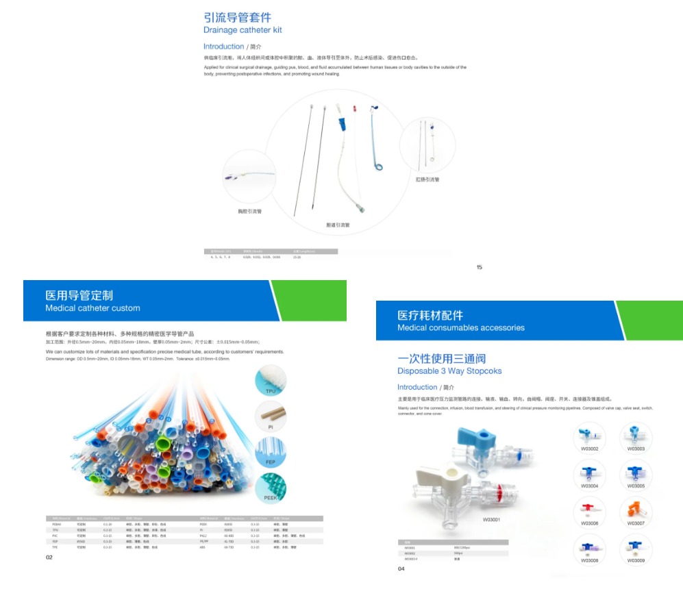 带线猪尾巴引流管、带显影环猪尾巴引流管、编制增强引流管、picc导管、血液透析导管、CVC、鼻胃肠管、各种扩张器/鞘/护套/支撑管等
