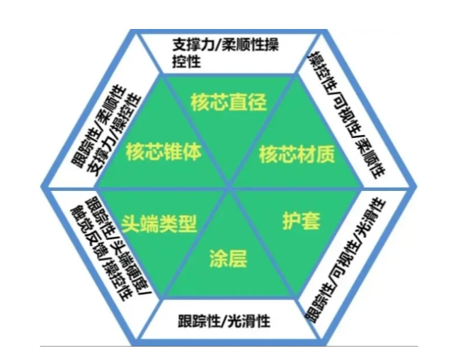 核芯的直径决定了导丝的软硬程度,直径越大,导丝越硬,导丝的支撑性能和扭转性能越好,推送力衰减较小,但相应地,灵活性越差。