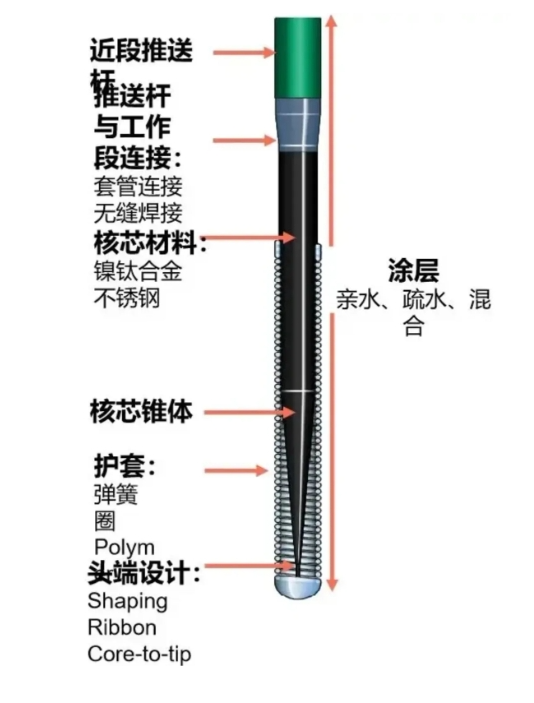导丝的性能差异由导丝的结构决定。导丝主体一般可分为芯丝、绕丝,部分含有安全丝,可带有涂层,部分获批上市的产品还会包含延长导丝、扭转装置、塑形针等组成部分。