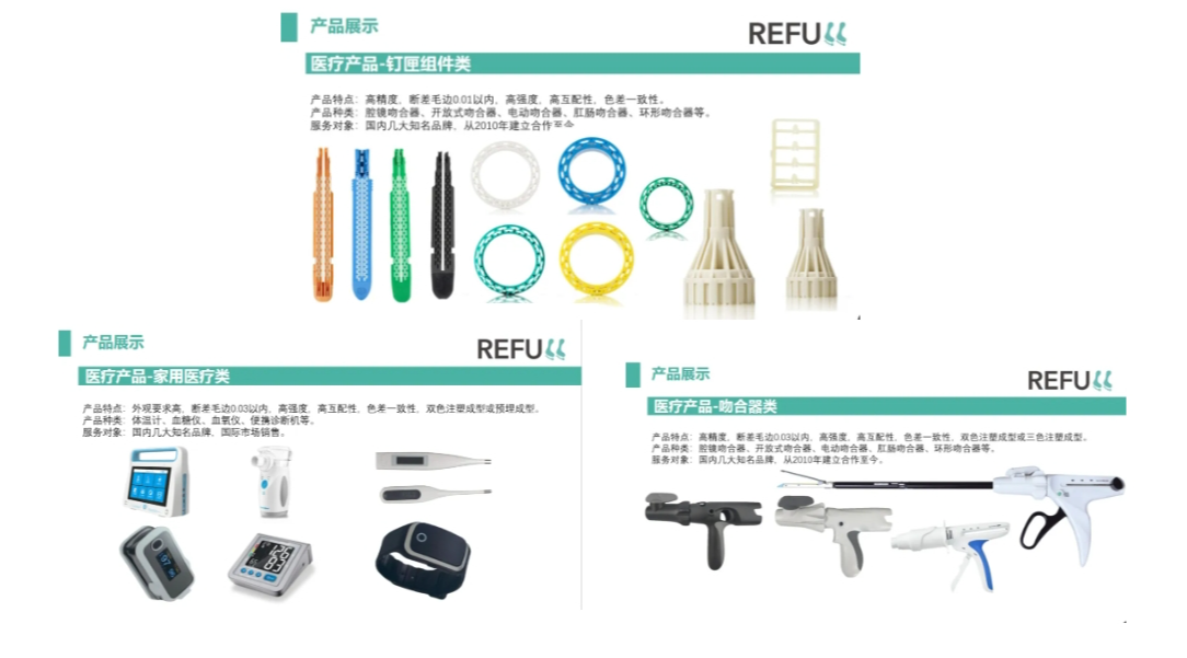 高精度,高强度,高互配性,色差一致性,双色注塑成型或三色注塑成型。 产品种类:腔镜吻合器、开放式吻合器、电动吻合器、肛肠吻合器、环形吻合器等。