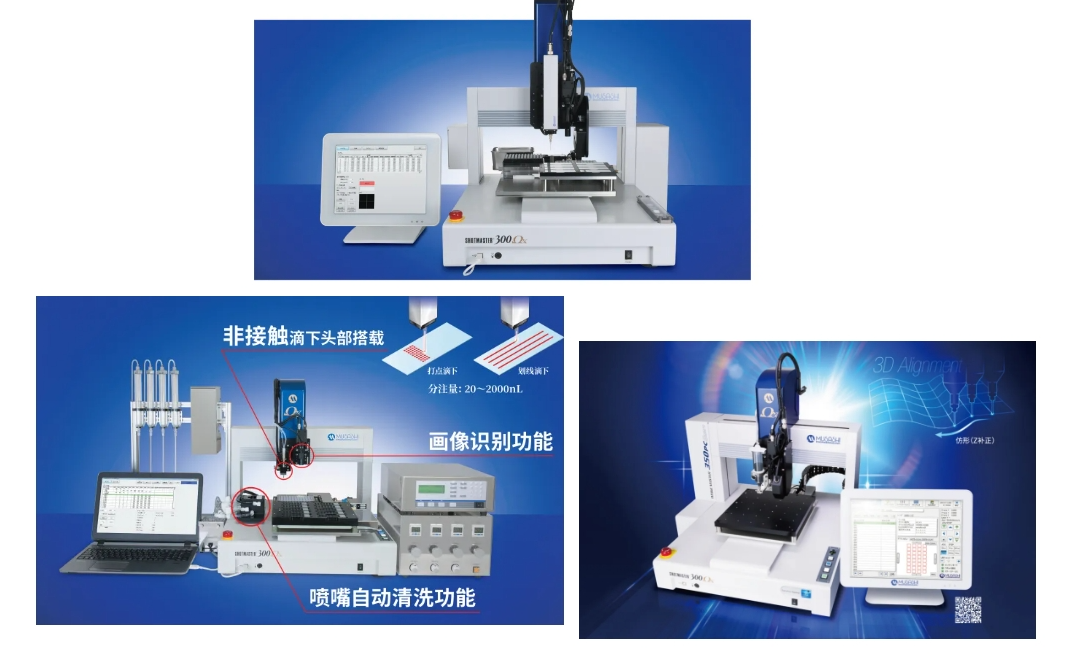 Jet Spotter生物芯片试剂点样系统 多种类试剂超高速、非接触喷射点样 优势: ①通过非接触滴下,防止样品的交叉污染。 ②通过从喷嘴前端吸引、点样,节省了试剂的消耗。 ③通过专用软件,快速制作图案。