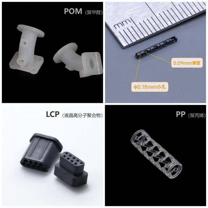 为解决高精度医疗应用材料难题,摩方精密自研可溶性牺牲树脂(SR),结合翻模、注塑工艺,突破光固化材料在医疗端的限制,获得传统注塑、或直接3D打印所不能制作的特殊零件,例如可实现PDMS/POM/PP/LCP等材料零部件制备。