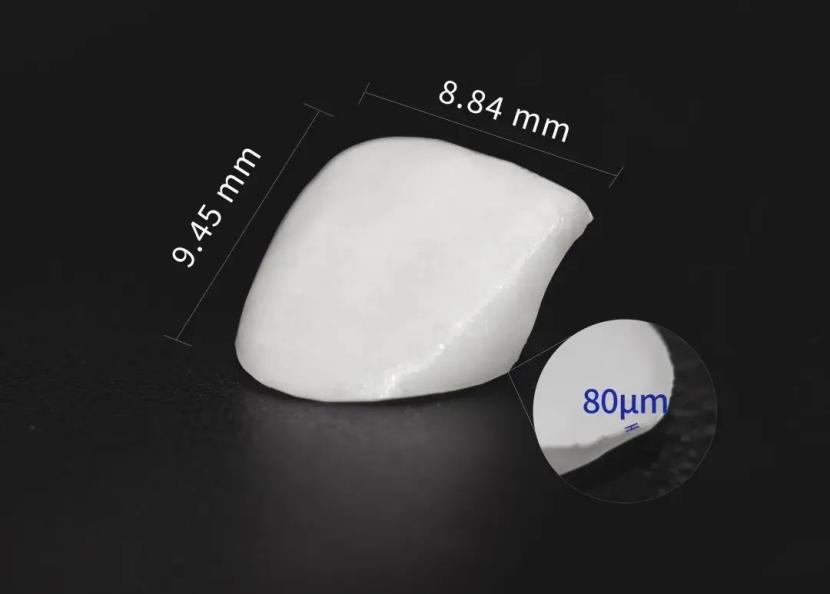 在陶瓷材料方面,氧化锆以优异的生物相容性、高强度与耐磨性,成为口腔修复材料与部分高值医疗器械的首选陶瓷材料。基于摩方精密微纳3D打印工艺,实现了 80 μm超薄精度的制造突破(较传统机床车削产品厚度降低 75%),同时推动氧化锆材料及制品通过中国三类医疗器械注册证和美国 FDA 认证。并于今年6月,携手国际牙科巨头Ivoclar Vivadent义获嘉伟瓦登特,围绕义获嘉专业粘接产品与摩方旗下 “皓昕极薄氧化锆贴面” 展开大中华区市场协同推广,共同推动口腔无创修复技术的革新与普及。