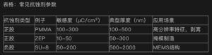 ·正胶:曝光后溶解性增加,被显影液去除。常见种类包括PMMA(聚甲基丙烯酸甲酯)、ZEP和PBS。PMMA是行业标准,易于处理,适用于高分辨率特征和剥离工艺。