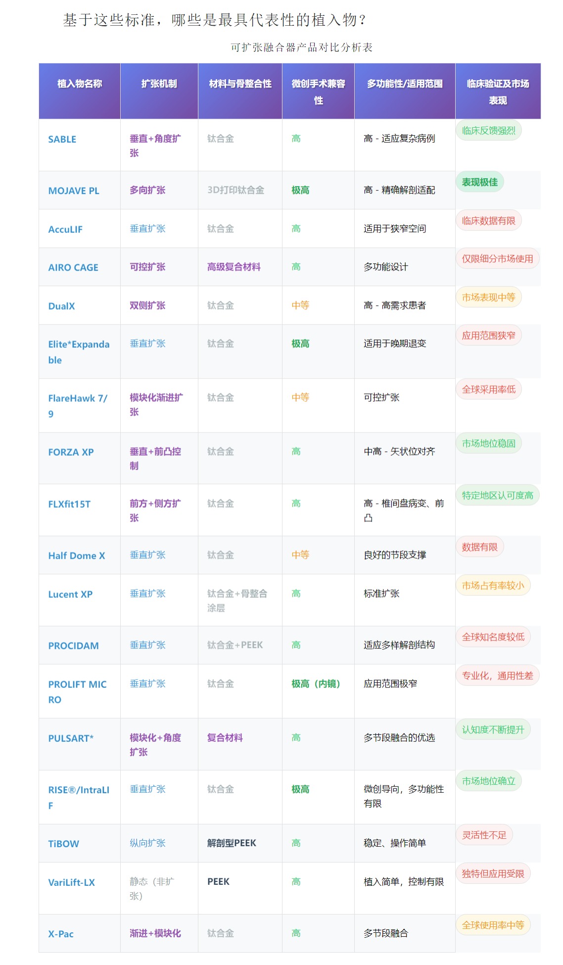 技术已发展到这样的程度:大多数可扩张腰椎融合器都具备了极高的品质。选择合适的产品取决于几个关键因素,这些也是我们进行筛选时的重要考量标准,包括所用材料、与微创手术(MIS)的兼容性、扩张机制类型,以及各设备可获得的临床经验数据。基于这些标准,我们筛选出了众多最符合要求的植入物。这并不意味着其他系统——即使是那些临床历史相对较少的产品——就不够优秀,甚至可能更加出色。我们的清单仅反映了基于特定评估重点所得出的结果。
