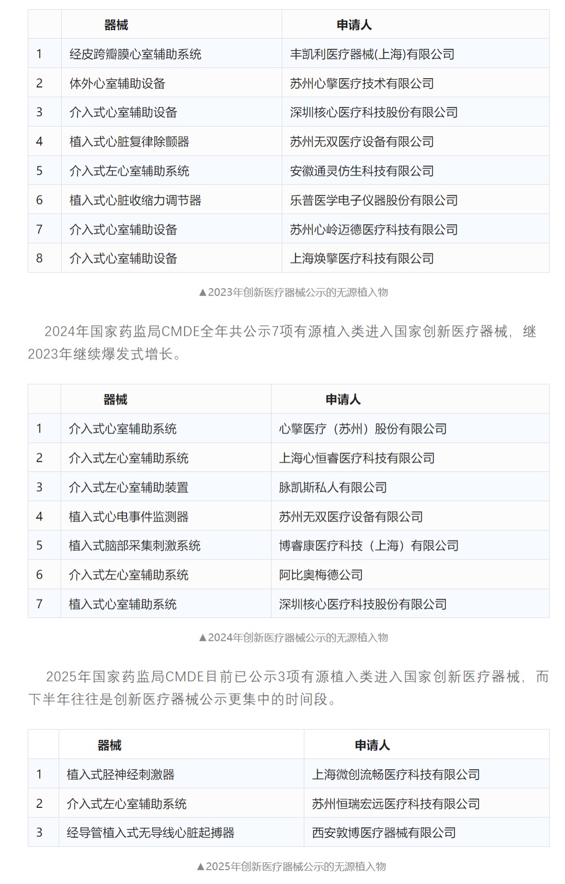 从国家创新医疗器械的公示来看,近三年属于有源植入物的爆发期,主要集中于神经刺激器、人工心脏、心/脑起搏器。