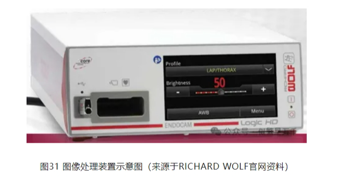 图像处理装置也是内窥镜中重要的设备,其主要功能是将内窥镜获取的图像转换为显示器所支持的格式,同时还会根据需要对图像进行变焦、快门、白平衡和自动增益控制等处理,有时还需与光源配合,进行亮度调节、图像增强等操作。当然,对于成像,低时延和无卡顿也是非常关键的。在内窥镜成像前端性能同等的情况下,图像处理能力越强,所获得的成像体验越佳。如图31所示为图像处理装置示意图: