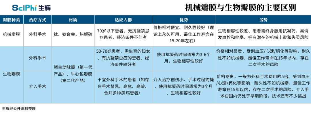 图丨机械瓣膜与生物瓣膜的主要区别 生物瓣与人体瓣膜生物学特征相似,具有较好的生物相容性和血流动力学性能,凝血、溶血和血栓等问题发生率低,患者术后仅需服用 3~6 个月的抗凝药物。但生物瓣的使用寿命短于机械瓣,最多仅能维持 15 年时间,这是其在国内应用首先的原因之一。