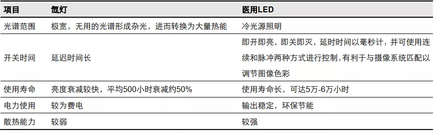 光源作为内窥镜整机系统的重要组成部分,其颜色、亮度、均匀性和稳定性等性能对图像质量具有重大影响。传统内窥镜系统采用氙灯、卤素灯照明,近年来,逐渐被成像视觉效果更佳的医用LED光源替代。LED光源具有无污染、亮度高、寿命长、转化率高等优势,可在内窥镜临床使用时为其提供照度佳、成像清晰的窥视光源,并在体内器官的检查、治疗、手术以及摄像和录像时提供良好的照明。