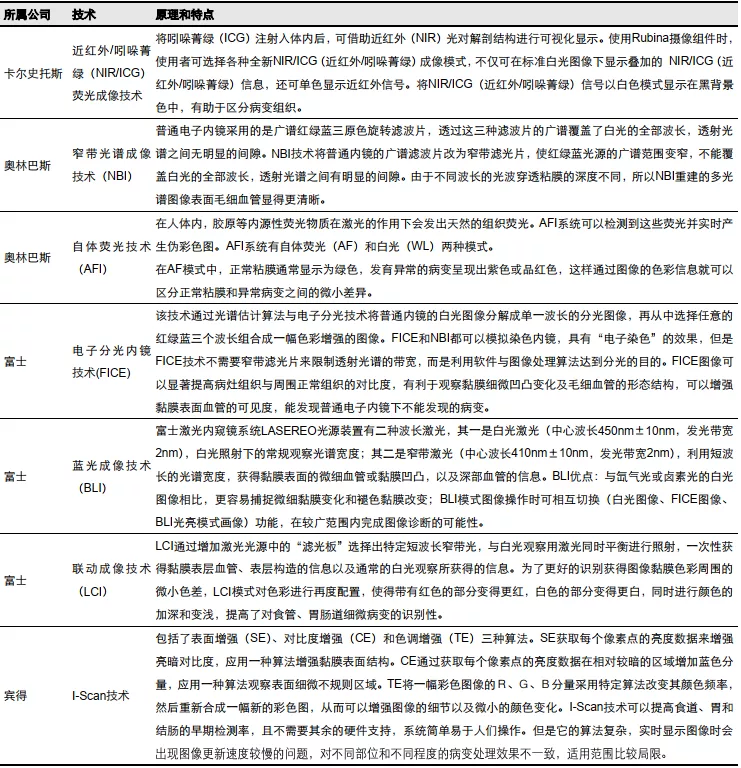 进口内镜厂商普遍拥有领先的图像处理技术。卡尔史托斯有近红外/吲哚菁绿(NIR/ICG)荧光成像技术等。奥林巴斯有窄带光谱成像技术(NBI)、自体荧光技术(AFI)等。富士有电子分光内镜技术(FICE)、蓝光成像技术(BLI)、联动成像技术(LCI)等。宾得有I-Scan技术等。这些技术的使用有助于帮助术者更好的区分病变组织,提高诊断的准确性。