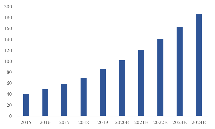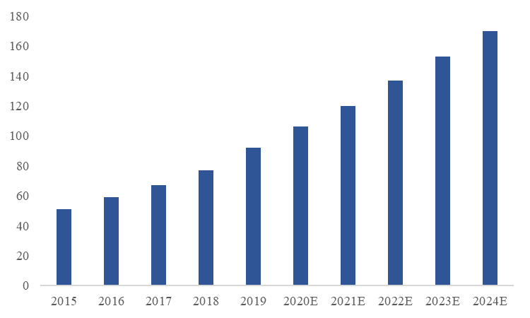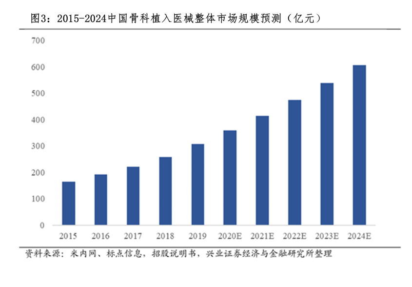 我国骨科植入医疗器械的发展尚存在较大的市场空间,具有较强的增长潜力。根据米内网、标点信息,以2019年的308亿元为基础,预计到2024年我国骨科植入医疗器械市场规模在607亿元左右,未来5年的复合增长率在14.51%左右,我国骨科植入医疗器械市场仍将保持快速增长的趋势。