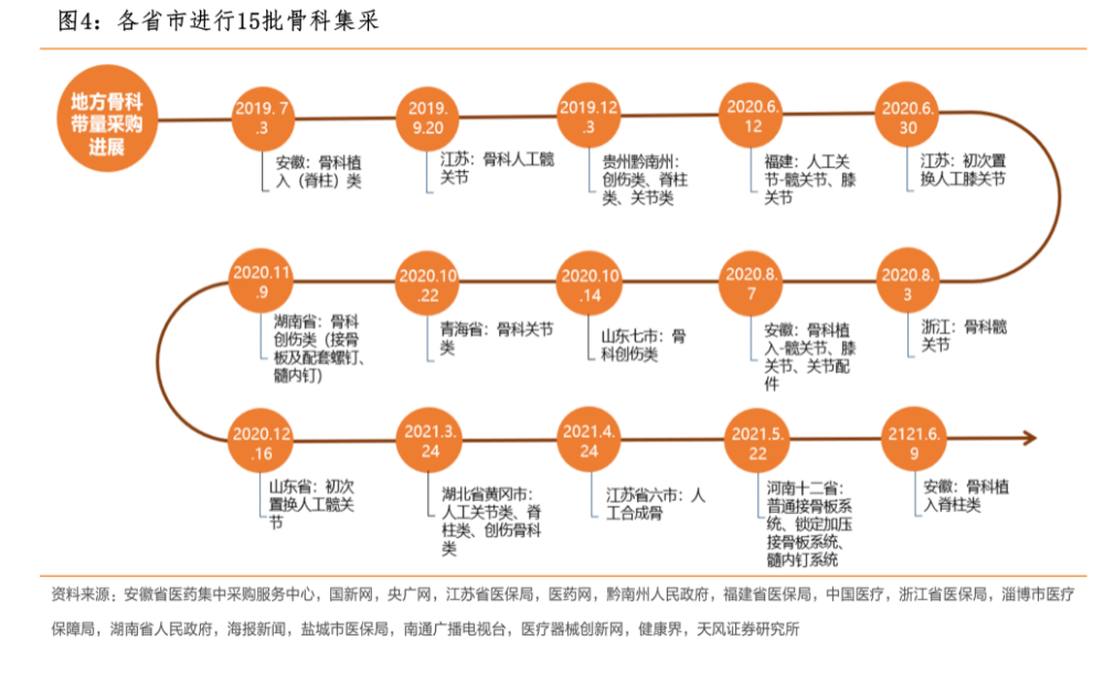 随着集采的开展,骨科植入器械的渗透率进一步上升。2019年7月31日,国务院办公厅印发了《治理高值医用耗材改革方案的通知》,在高值医用耗材领域探索带量采购。骨科植入物耗材作为临床广泛使用的高值医用耗材,带量采购在各地积极探索,截至2021年6月9日,各省及地市级平台带量采购已开展15批。