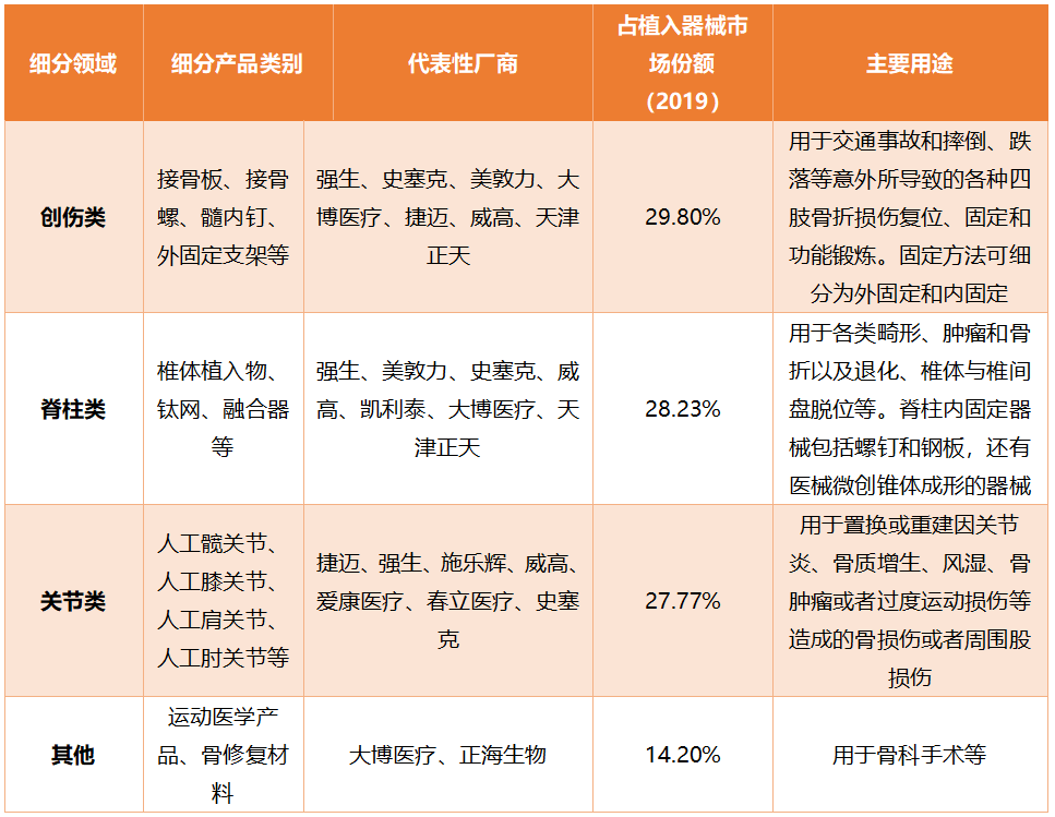 根据使用部位的不同,骨科植入医疗器械可以分为创伤类、脊柱类、关节类和其他四大类。骨前三者的市场份额占到骨科植入物市场的80%以上。主要包括骨接合植入物及关节植入物,如接骨板、接骨螺钉、髓内钉、脊柱内固定植入物、人工关节等。