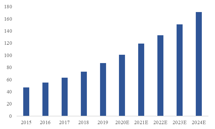 脊柱类植入医疗器械增速与市场保持一致。2015至2019年,脊柱类植入器械市场的销售收入由47亿元增长至87亿元,复合增长率为16.58%,与骨科植入医疗器械整体市场的增速基本保持一致。根据标点信息,以2019年的87亿元为基数,预计到2024年我国脊柱类植入器械市场规模在171亿元左右,未来5年的复合增长率在14.42%左右。