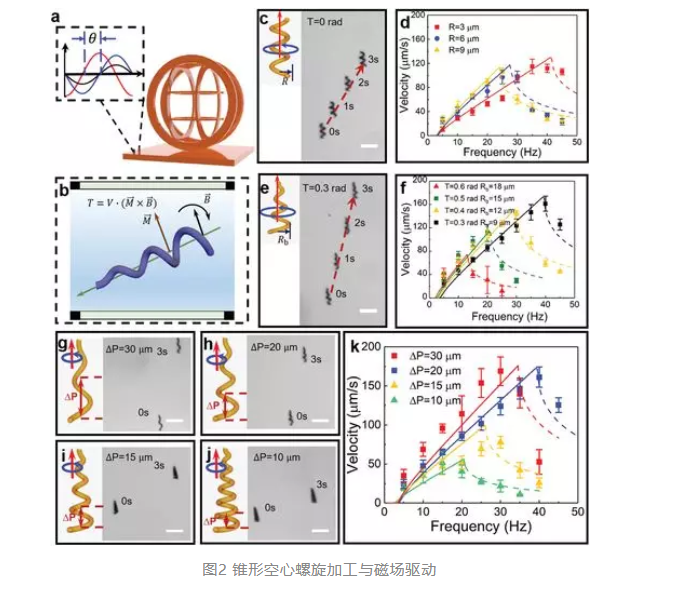 其次,利用如图2所示的锥形空心螺旋结构,并在其表面加入磁性响应材料。采用自行搭建的三维亥姆霍兹线圈控制系统,调节输入电流的相位信息在三维空间内形成旋转磁场,磁场方向的改变使磁性结构受到磁力矩作用,进而完成有效驱动。经对比发现锥形螺旋相比于传统的直螺旋结构具有更快的前进速度,并有效抑制了横向漂移运动。