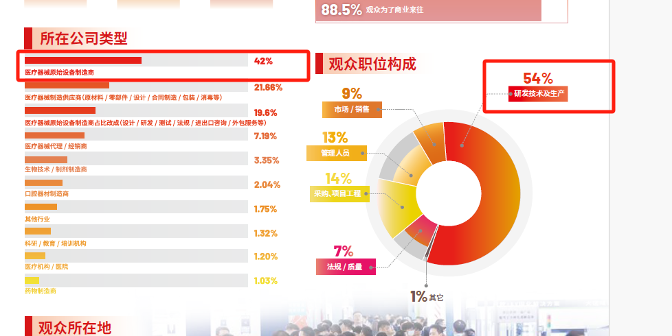 Medtec已经深耕中国医疗器械设计与制造行业20年,积累了深厚的专业经验和广泛的行业资源。不同于面向终端采购的医疗器械成品展,Medtec的观众群体以医疗器械企业的研发工程师、技术总监、采购人员为主,其中超过54%的观众来自国际和全国头部医疗器械设备企业的研发技术和生产部门。这种精准的观众定位使得Medtec成为医疗器械企业展示新技术、新产品、新解决方案的绝佳平台。