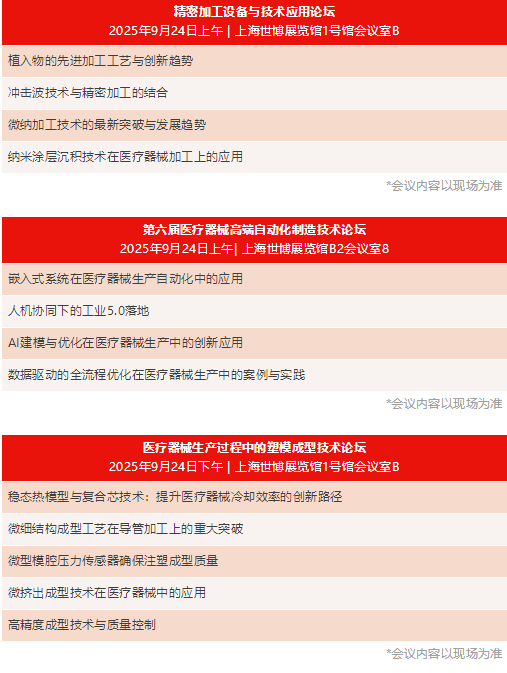生产制造工艺板块的会议将邀请行业内的专家学者、企业代表和技术供应商,围绕精加工、粘接焊接、塑模成型、包装灭菌四个方面,共同探讨医疗器械生产制造行业先进的技术及材料应用,使之更加匹配医疗器械的生产制造及性能质量要求,共促行业的创新发展。