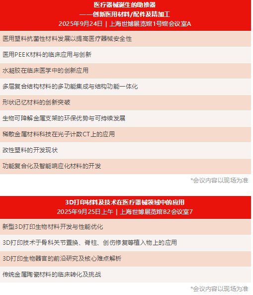 今年,2025Medtec国际医疗器械供应链生态峰会整合医用材料/配件及精加工、3D打印相关技术&材料、新型医用敷料等论坛,打造材料创新应用板块,汇聚医疗器械生产制造商、医用材料制造商、科研机构等各方代表,解读医用塑料抗菌性、PEEK、3D打印材料、可降解材料等材料的新技术、新方向,以及如何通过材料创新推动医疗器械行业的高质量发展。