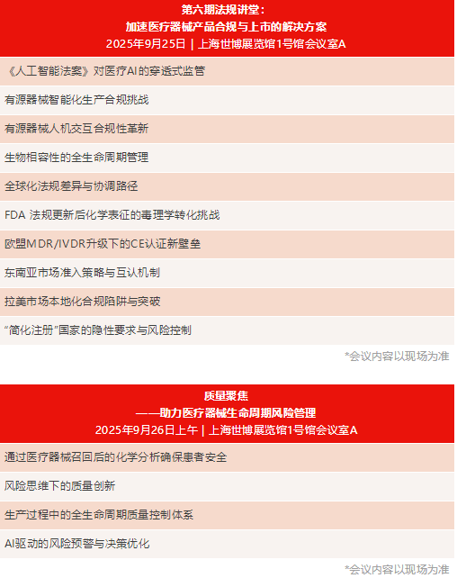 2025Medtec国际医疗器械供应链生态峰会的法规质量板块将包含第六期法规讲堂:加速医疗器械产品合规与上市的解决方案以及质量聚焦——助力医疗器械生命周期风险管理两个论坛,助力企业构建覆盖“研发-注册-生产-流通”全链条的全球化合规体系,推动技术革新与监管要求深度适配,提升前瞻性合规能力,抢占高质量发展先机。