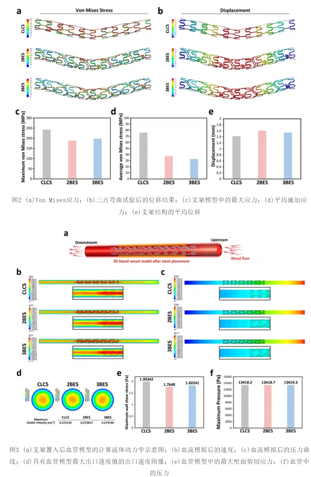 如图3e所示,CLCS的最大壁剪切应力值为1.9934 Pa,2BES的最大壁剪切应力值为1.7648 Pa,3BES的最大壁剪切应力是1.8224 Pa。与CLCS相比,在仿生支架中壁剪切应力略低,表明这些设计更多地分布剪切力,这是降低内皮损伤风险的关键因素。通过降低壁剪切应力,仿生设计可以通过保持内皮完整性和最小化再狭窄机会来增强支架的长期性能。