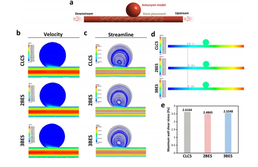 最近,韩国全北国立大学Chan Hee Park教授等人创新引入恶魔铁甲虫鞘翅的互锁椭圆结构(垂直-水平长度比1:1.8),设计双环(2BES)与三环(3BES)仿生WE43镁合金支架。通过系统性计算模拟并评估了仿生支架的力学性能。三点弯曲测试中2BES和3BES最大应力较传统支架(CLCS)降低21.99%与18.21%,压溃测试显示抗变形能力增强。同时,血流动力学模拟显示仿生结构在维持血流速度与压力分布的前提下,将2BES和3BES的直血管壁面剪切应力(WSS)有效降低,显著降低内皮损伤与血栓风险。该工作通过仿生设计同步攻克镁支架的力学缺陷与血流扰动难题,为可降解支架提供了兼具抗断裂性与低再狭窄风险的优化方案,推动其临床转化进程。