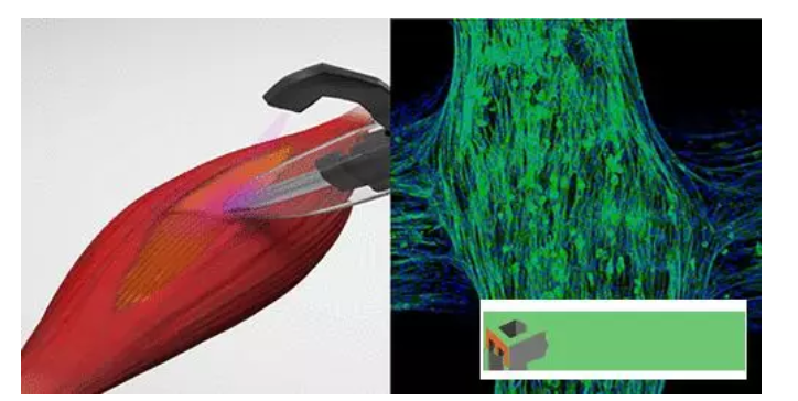 首先,科学家将基于明胶的水凝胶直接沉积到肌肉内不需要的间隙中。集成的紫外线可使凝胶固化成由微小的类肌肉纤维组成的生物支架,该生物支架易于粘附在相邻的肌肉组织上,无需缝合。肌肉细胞然后进入支架。在实验室测试中,该设备被证明可有效治疗小鼠的体积性肌肉损伤。