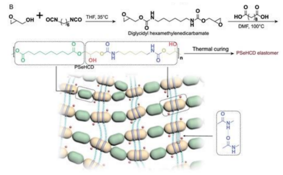 它的合成分为两步:首先在无水环境下进行了无催化剂的反应合成单体二缩水甘油六甲基二氨基甲酸酯,再用酸诱导环氧开环聚合方法合成了PSeHCD,即聚(癸二酰基己二氨基甲酸甘油二酯),如图。