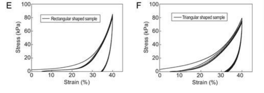 图(A)原始和自愈合PSeHCD-60条的应力-应变曲线。(B)已愈合的PSeHCD-60条带拉伸前后的光学图像;黑色箭头指愈合区域。(C)PSeHCD-60薄膜表面划痕自愈过程的显微图像。在15°C(标尺:50μm)下,划痕在3 min内完全愈合。(D)在100℃下对PSeHCD-72进行10分钟后处理和整形(标尺:5毫米)。(E)原始(矩形)和(F)再加工(三角形)PSeHCD-72弹性体的循环压缩应力-应变曲线验证了再加工后良好弹性的保留。