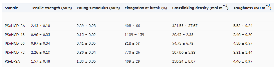 合成的PSeHCD具有独特的酯-聚氨酯交替结构,是其力学性能和自愈性能的关键。该聚合具有多种用途,适用于不同的异氰酸酯、环氧化合物和聚酸类化合物,可以生产出一系列复杂的杂化材料。该团队以全化学交联PSeHCD-SA和PSED-SA为对照组,通过拉伸试验研究了自交联PSeHCD弹性体的力学性能如下图。