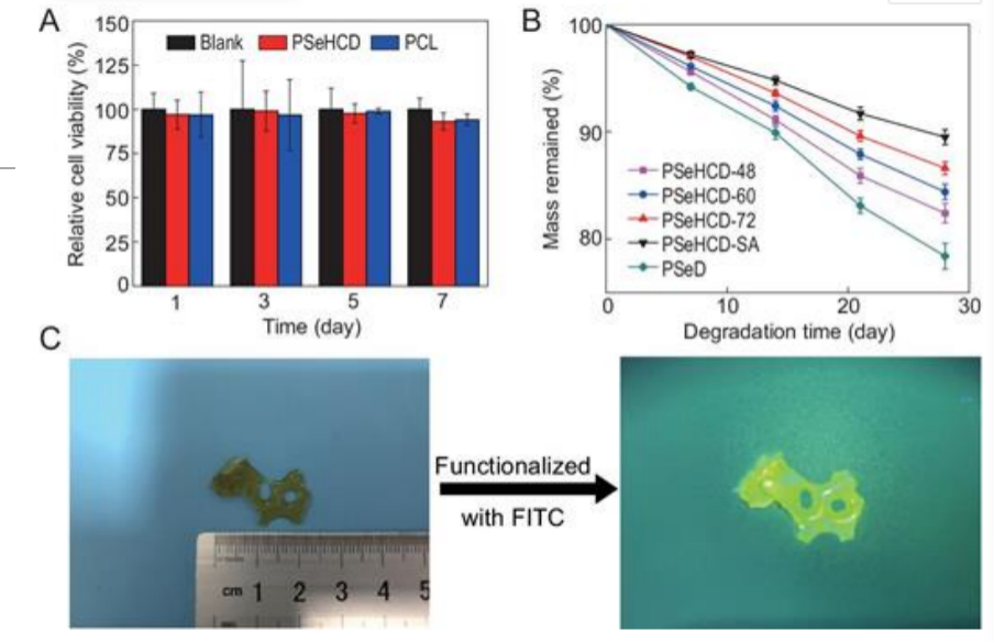最后,该团队将成纤维细胞接种于PSeHCD弹性体上,以聚己内酯(PCL)为阳性对照,观察离体生物相容性和降解性。