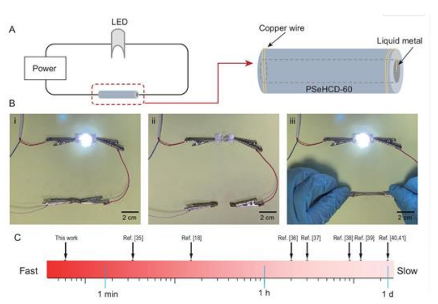 一旦导体被切成两半,LED就关了。当两片在室温下接触21s而不需要任何外部能量输入时,LED可以再次点燃,愈合后的导体也可以拉伸到340%。PSeHCD弹性体复合导体在室温下表现出最快的自愈合速度。