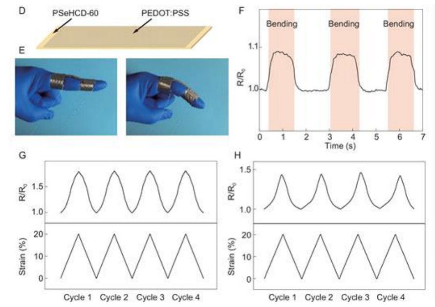 将复合传感器由两个导电带固定在食指上,作为可穿戴设备,实时监测关节运动。当食指弯曲时,观察到阻力的迅速增加。测试了复合传感器的电阻响应与应变之间的关系。与近年来的报道相比,PSeHCD弹性体复合传感器具有更高的应变灵敏度在室温下,被完全切断并愈合2 min的复合传感器呈现出电阻的动态响应。