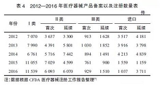 从表3中可以更深入地了解到新的政策法规实施对不同类别医疗器械生产企业的影响情况。从2012到2015年,从事第一类、第二类医疗器械生产活动的企业总体上处于增长状态。而对生产第三类医疗器械的厂家而言,2012-2014年每年都有小幅增长,但在2015、2016年均有减少。这与2015年3月国家开始要求第三类医疗器械生产企业全面执行医疗器械GMP 有直接关系,生产质量体系不合规且整改不合格的企业直接被淘汰。